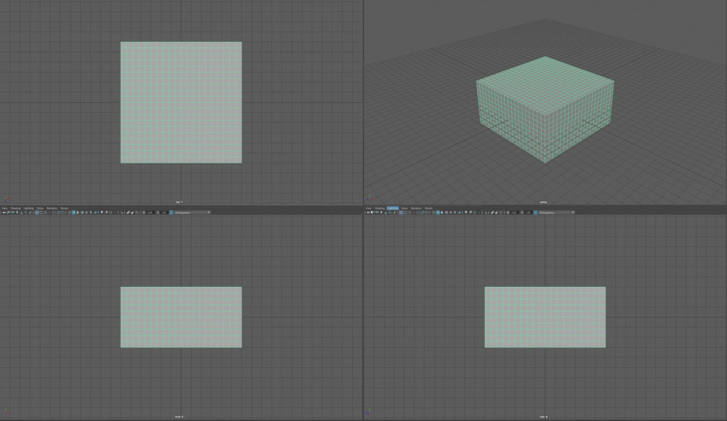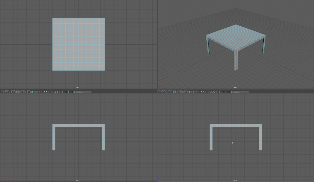 This is my attempt at the task to create a table scene with a fruit bowl and several pieces of fruit. To begin this task, I created a table by using the Polygon Cube tool and increased the size to 10x5x10 to create a large surface area. From here I added 20x10x20 in the subdivisions menu to ensure the blocks were of equal size. By using the X and Z views I was able to remove the faces creating four legs for the table to stand on followed by an extrusion to provide depth to the table.
