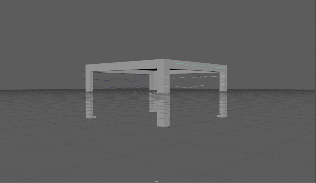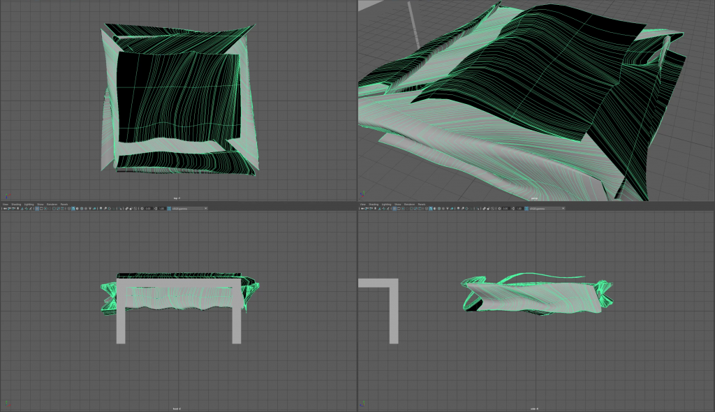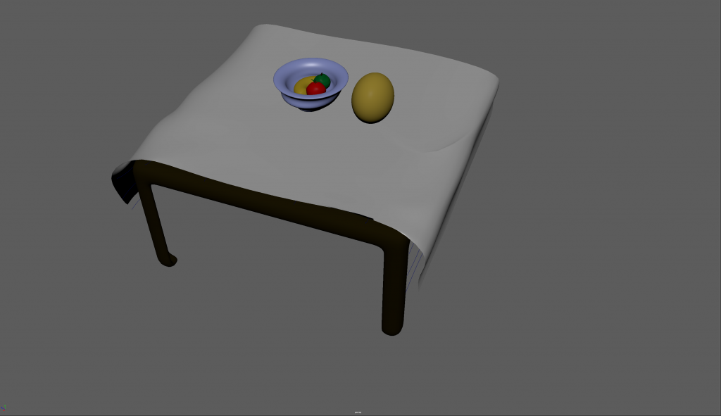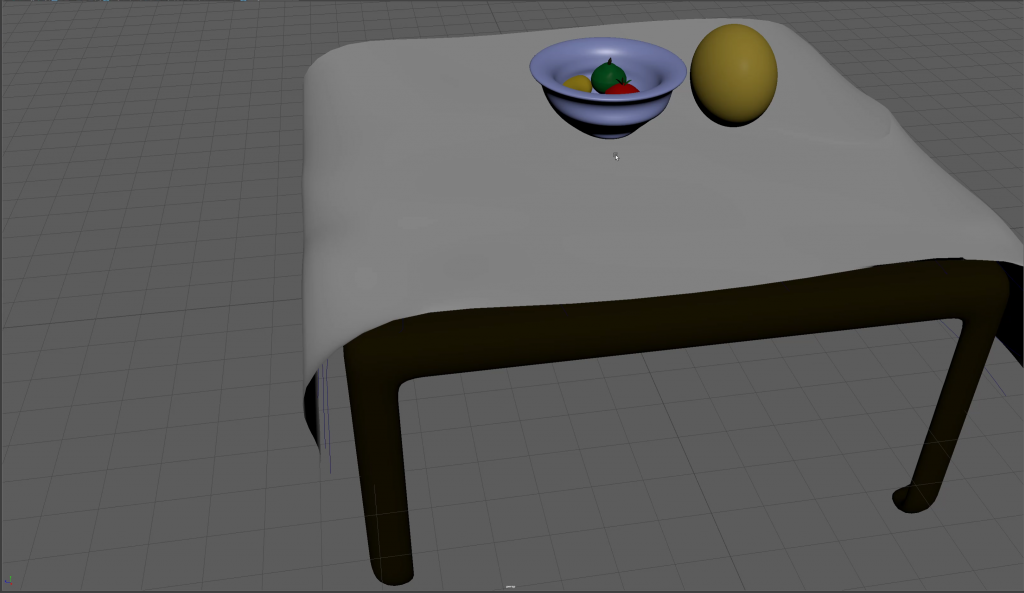 I added a number of EP curves to provide the basic folds for a tablecloth then moving their positions using the axis viewers to correctly line up all five sides. This presented an issue when I joined them up as it made a shape that was in places correct and often, inside out. To rectify this, I chose to eliminate 2 of the sides to create a straight flow over one end of the table to another which was far simpler (I intend to find out how to make this process work in the future for the other two sides).