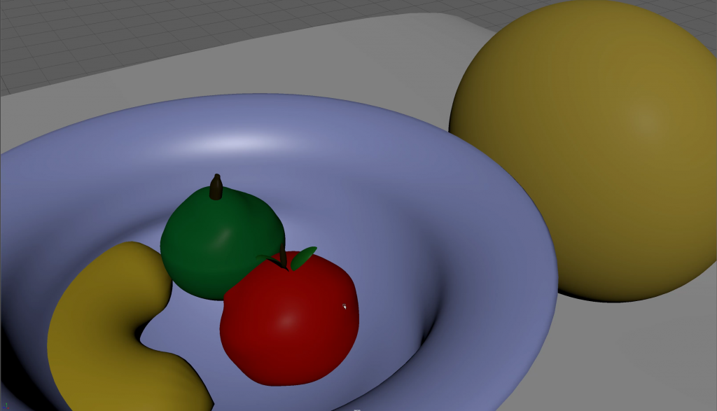 Creating the fruit and bowl was relatively simple, by using basic shapes such as the Polygon Sphere, cube and Taurus as the templates. For the bowl I removed half of the sphere using the face tool in the X axis and extruding it out before playing with some of the vertices to give it a unique look. The same process applied to all the fruits such as the Apple which was a deformed sphere and the stalk was created with a deformed cube shape. To create the leaves on the apple I cut several faces from a sphere and copy pasted it to give it a little more life. Unfortunately, I have no experience using UV mapping or have much of a grasp of texturing beyond basic re-colouring hence everything looks a little flat and lifeless. This is something I will address in the future.