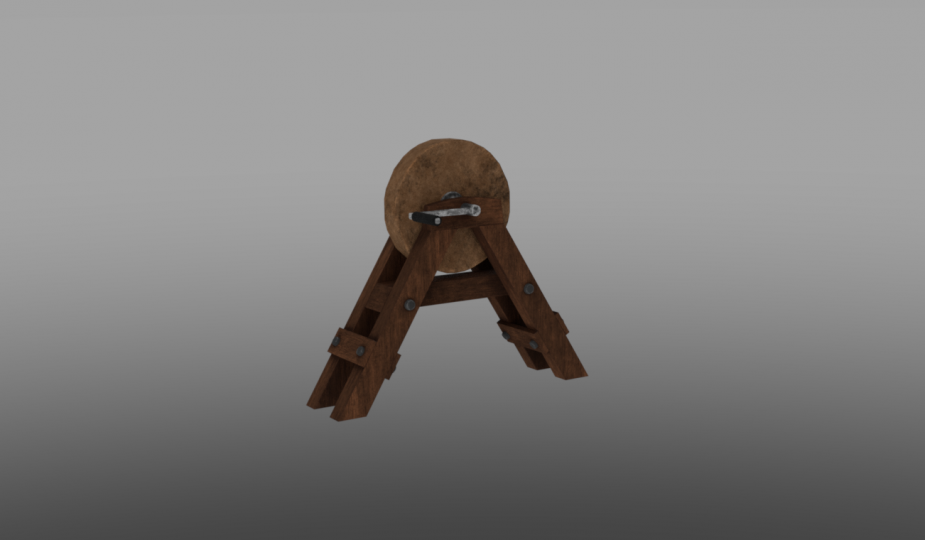I wanted my version of this item to look as if it was relatively new. In my design process I simplified the handle with a number of extrusions and added a leather handle to make the piece easier to operate. I incorporated the turning wheel into the grindstone as if it was set within concrete. The operation of this wheel would lead to collapse if it was fastened together without the large pegs through each of the connecting points.