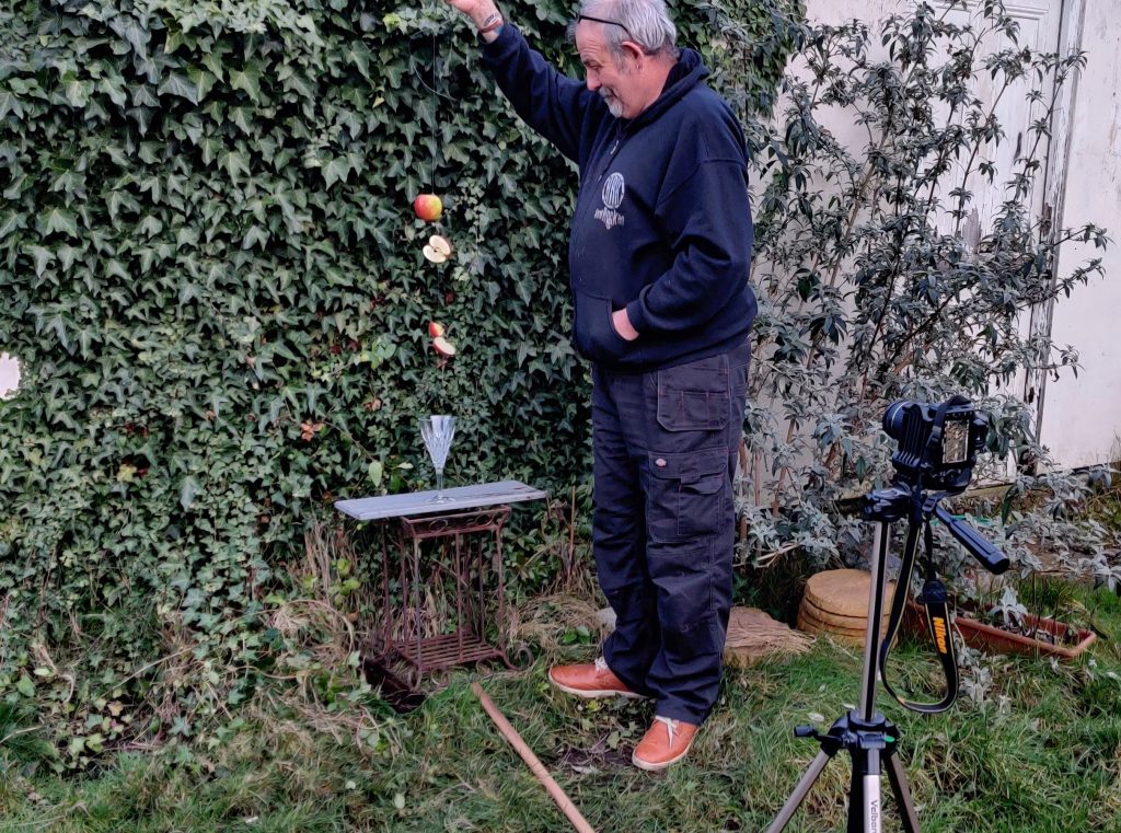 I framed the shot by placing the glass on a pedestal with the intention of removing it in post, but I liked the aesthetic of the glass against the grey painted wood. I took a number of photos of the apple line at various heights and had the wire spin, so I had a multitude of shots to use. The benefit of shooting in the exact same spot meant that the lighting and shadows would stay consistent making it easier to edit towards the end.
