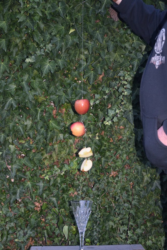 After cutting up several apples I threaded them with fishing wire and looped around them so they wouldn’t fall down the wire during the photoshoot. This proved to be a problematic approach in the editing stage as the wire is rather thick and visible.