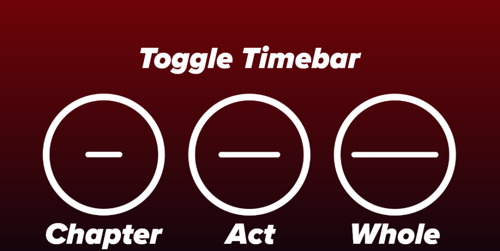 In the media player component of the application, I added a toggle function for a micro macrocosm approach to viewing the time bar. By default, the timebar shows the entire runtime of a narrative. By interacting with this element, the listener can change the function to display either chapter, act or whole runtime.