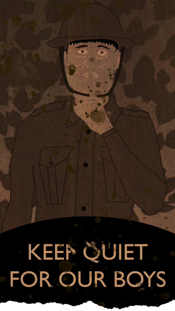 Further examples of this style of world building are present in the Propaganda posters made in Adobe Illustrator. The “Keep Quiet” poster I created has aged significantly as it would be stuck against a wall outside, exposed to the elements. By importing the clean version into photoshop, I applied a rust texture and used transparency effects to age the poster suitably.