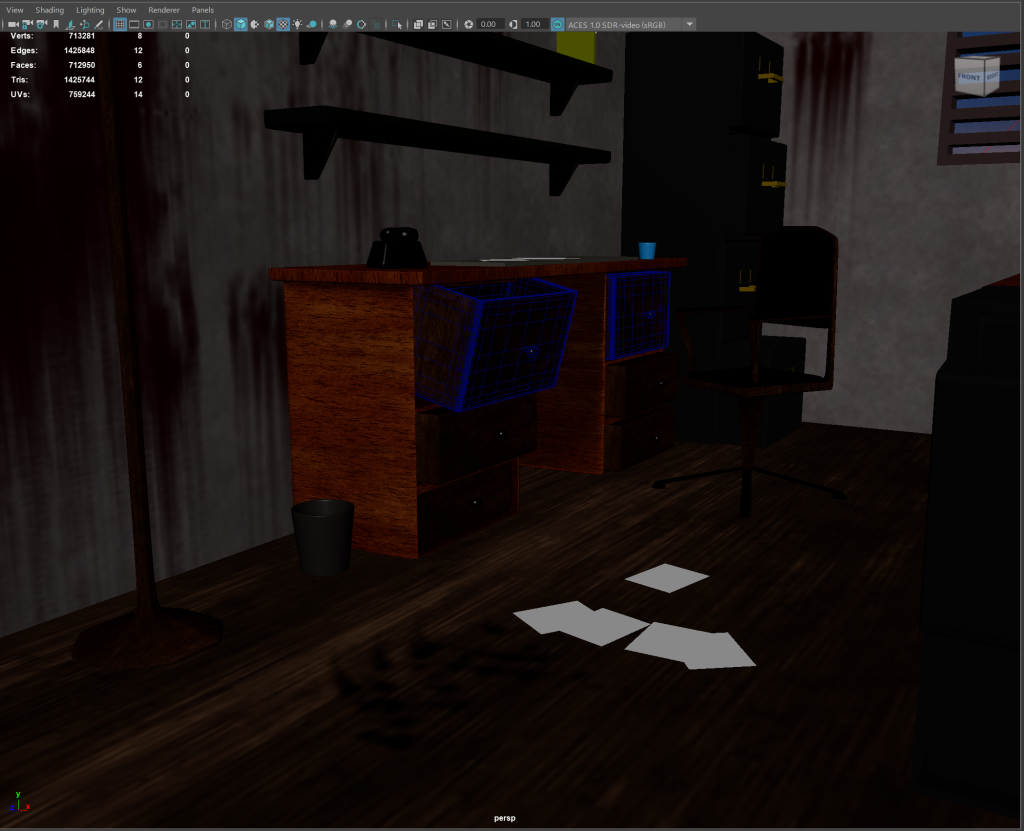 Using Maya, I sculpted each asset that would be used within the environment to help to forge a believable world for the player to be engaged within. Some assets were textured using Maya’s built in tools for simple objects, such as a black reflective surface for the body of the fire alarm. The higher quality props in the scene (Hero assets) would have to go through Substance Painter as it has a far wider toolset, allowing for many different materials to be baked onto the asset. For example, the bell on the alarm has a scratched metal surface and where the striker has hit it I applied a worn steel paint layer to provide a small amount of damage. Consideration for small details such as this can help to convince the player this world is lived in and existed prior to their interactions within it.