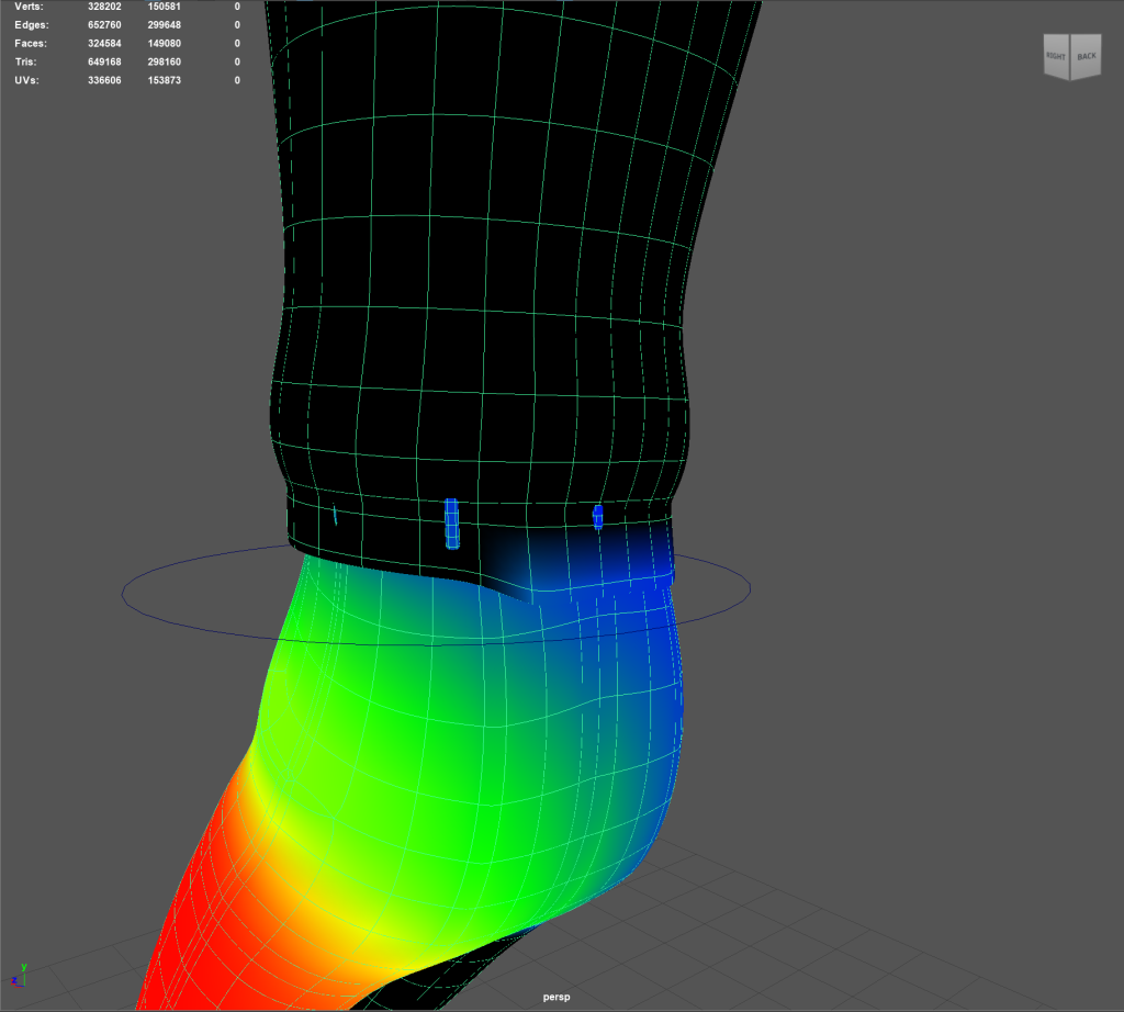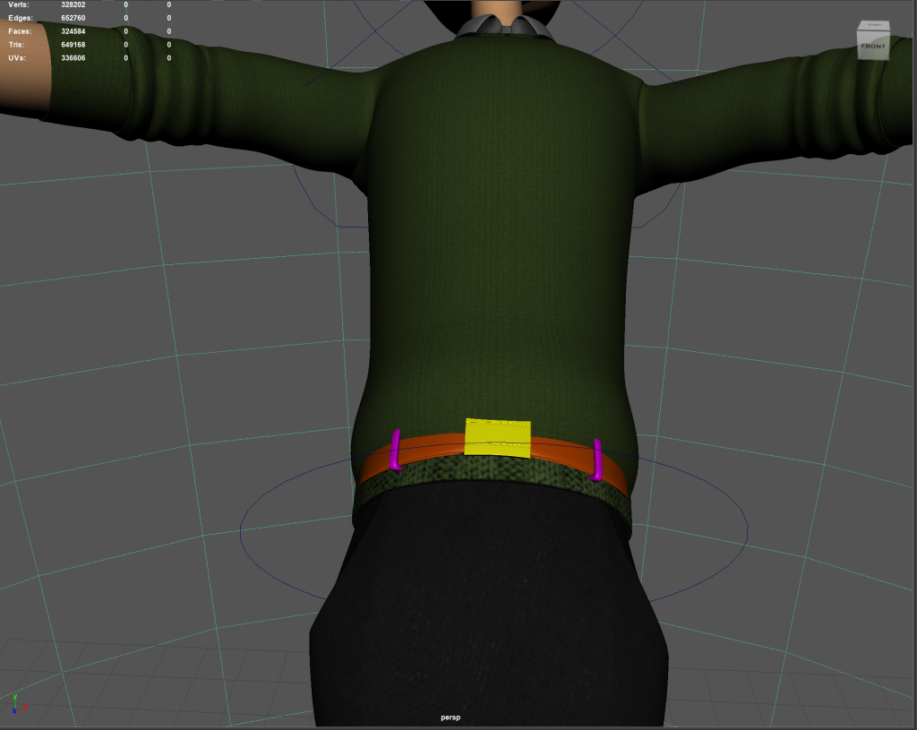 For some reason on the inside of the model I discovered that they had modelled and textured a belt, which would appear when I twisted the body to see if any polygons would jut out from the waistline area between the jeans and jumper. I cannot understand why this model would have this but it caused another issue for me to try and fix with weight painting. I resolved this issue by finding the lamberts and blinns that would pop through and increasing their transparency slider all the way to maximum in the texture editor menu.