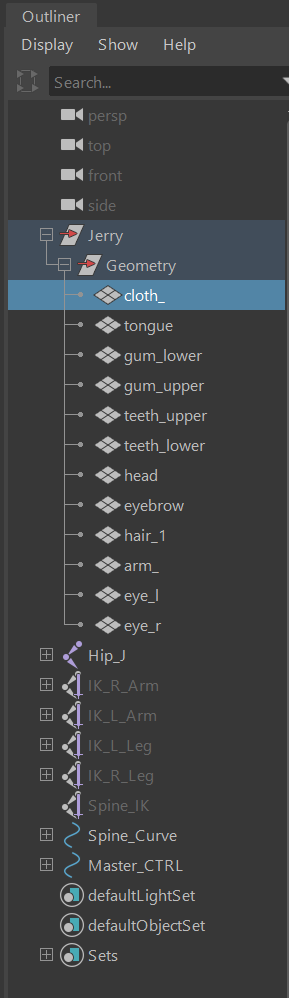 In this series of blog posts I will be exploring the processes of creating a rigged character for usage in Maya for animation. Firstly, we will take a look at the Skeleton and IK handles, followed by weight painting and blend shapes. I was unable to use the character I developed in the last module as the poly count was far too high for such a poor character and through testing the models viability for this project, I realised there were too many flaws in the mesh and I was unable to fix Cassian in a timely manner. I attempted to use the Jerry model but had used MaxforMaya for my final animations.