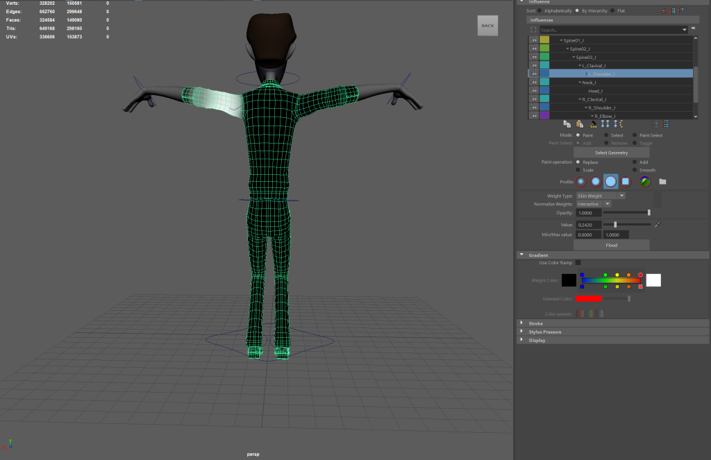The colour ramp function proved to be helpful at this stage as without it the difference in tone between the black and white was not as obvious as it should otherwise have been. While exploring the joints and seeing which had the largest impact. For the lower half of the body it appeared that the general joint for the legs impacted around 50 percent of the model up to roughly just below the ribcage area and as far as mid shin bone.