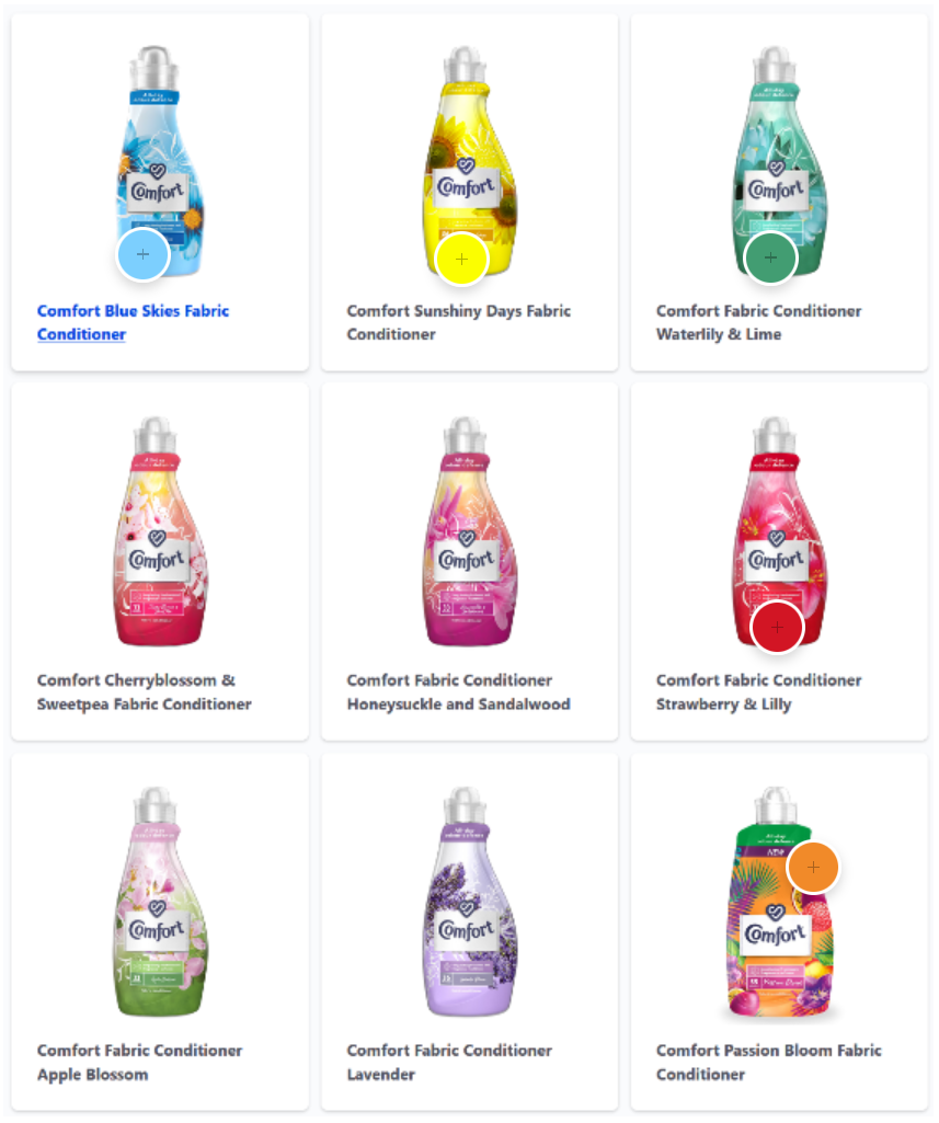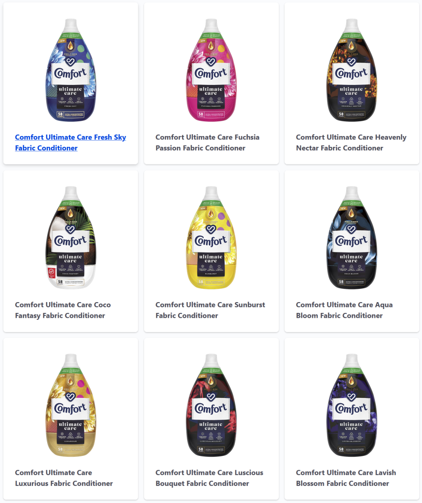 Examining five products from the Comfort Fabric Softener range helps to understand the usage of colour and theming within a product line. This is less focused on the individual brand itself but subsections of one of Comfort’s product lines.