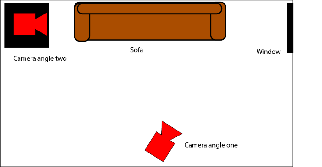 There are two angles for these shots I want to use. The first is a static tripod shot offset towards the window. This will show the room is illuminated and cast a shadow from “Jim”