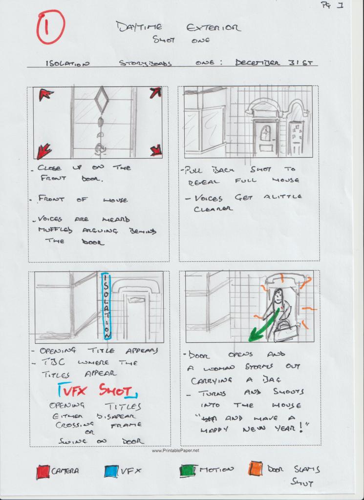 Sarah storms out of the door cursing at Jim as he stands helplessly watching her leave. The title of the short is on the wall between the door and window and disappears as the text is passed by Sarah. An audible argument is heard prior to the door opening and muffled until the door is opened as she speaks her final words