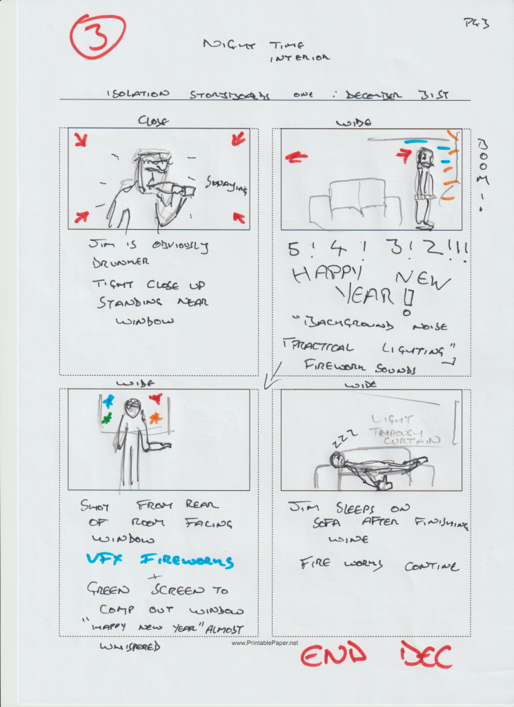 Fireworks explode outside as people counting down to the new year can be heard. Jim stands at the window watching the fireworks explode outside as he drinks from a bottle of wine.