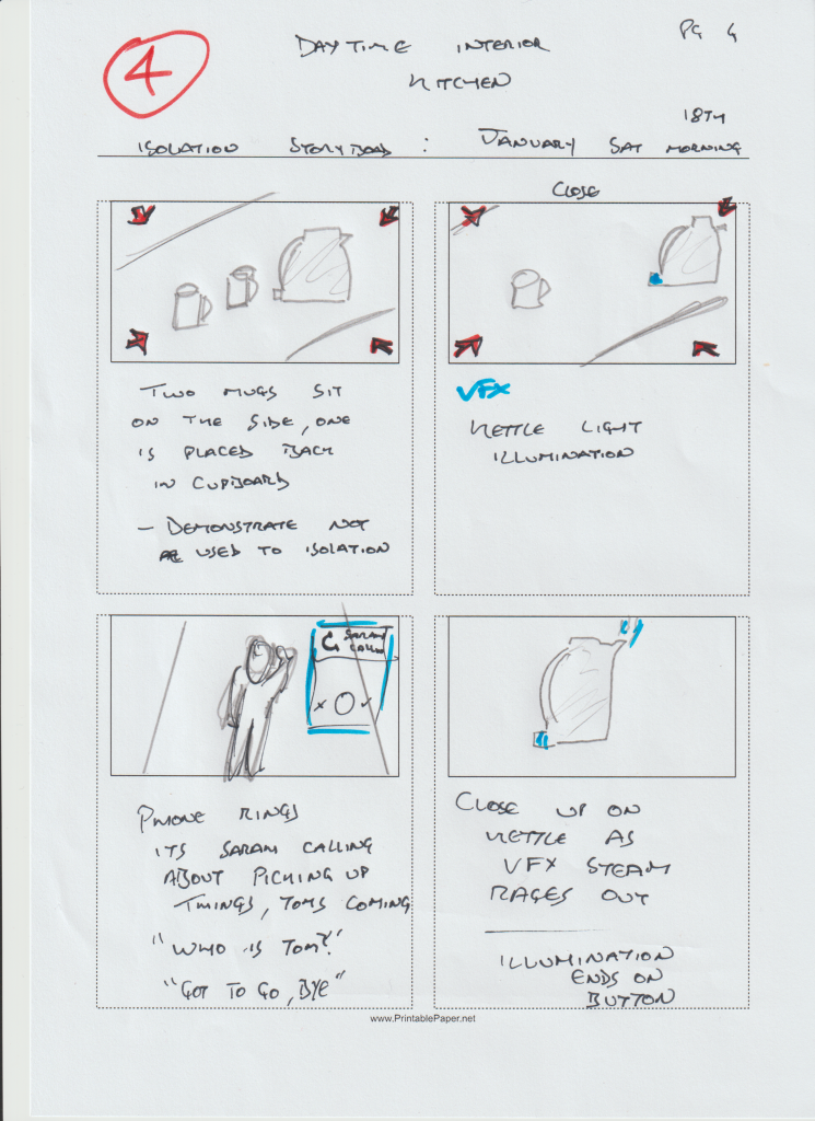 Jim wakes from sleeping and goes to make a coffee downstairs, pulls out two mugs before placing one back. Turns on the kettle and add VFX illumination to the kettle and steam rising when it boils.