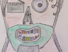 This is a quick conceptual sketch to convey my first idea for my poster. This poster will be accompanied by text and a logo. I intend to use photoshop to create this image by photographing a mans face and replacing the majority of the identifiable regions with various pieces of film making equipment. For example, …